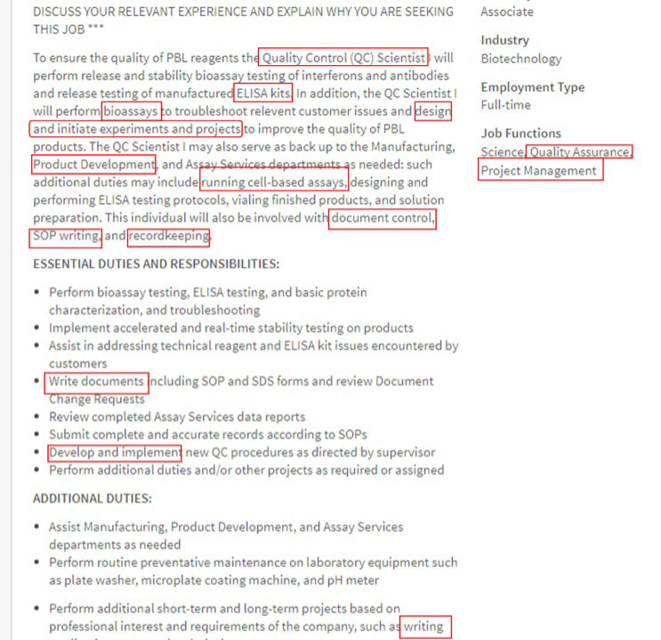 This was adapted from Cheeky Scientist’s webinar titled: Tailoring your resume for an industrial job. “A good resume is not enough to get a job, but a bad resume is enough to keep you from getting a job”. This was a quote that struck me as I was watching the webinar hosted by Cheeky Scientist’s Isaiah Hankel. During the hour-long webinar, I learned about tailoring one’s resume for a job in industry; a resume optimized for a non-academic career. One of the goals of an optimized resume is to ensure your resume will not be reduced to a “bunch of metrics”, which is used to evaluate how qualified you are for the job. Everyone should learn about the Applicant Tracking Software (ATS), which is used to weed out most of the submitted resumes. Some of the things that ATS focuses on are (1) Keywords usage and your answers to the application questions (more on the keywords below). (2) Salary expectation; the elephant in the room. (3) Inaccurate representation of your work history. Companies are not the only ones who use ATS to remove candidates that may not be qualified for a job position, recruiters use them as well. Moral of the story? Get your resume in top-notch shape before sending it out for a job application. An average recruiter spends 6 seconds before deciding whether to keep or trash your resume (read here). Therefore, avoid jargons and big words, but tailor your resume to their level. Here are some of the tips, shared by Isaiah, on creating job-attracting resume: 1. You should keep the resume as short as possible. 2 pages, or less, with a lot of white space. Make your resume clean; if your resume is wordy it will be overwhelming to read. Remember that you have 6 seconds to make an impression. 2. You should not start with the “Education” section. Start with your summary statement, followed by your professional experience, and then your education section. They know you went to school and you have a Master’s or a Ph.D. degree. What they care about are your qualifications and this is what you should highlight in your resume. Keep in mind that your resume will be skimmed from top to bottom, therefore, you should list the important things first. 3. You need a strong professional summary statement. Include at least 3 of your biggest achievements so far. This should utilize results-oriented bullet points in a list format. You want to include phrases such as, “resulting in” and “as demonstrated by”. Each statement should have 3 main parts: transferable skills, technical skills, and quantifiable results. Here is an example: “Strong project management skills with experience supervising research scientists on collaborative projects, which resulted in 5 publications and $500,000 in grant funding.” 4. You must use the company and position-specific keywords. Focus on the nouns and adjectives. While looking at a job posting circle or outline the keywords describing the job and its qualifications. Incorporate those words into different areas of your resume. Here’s an example below, the keywords are boxed in red (see if you can find additional keywords):