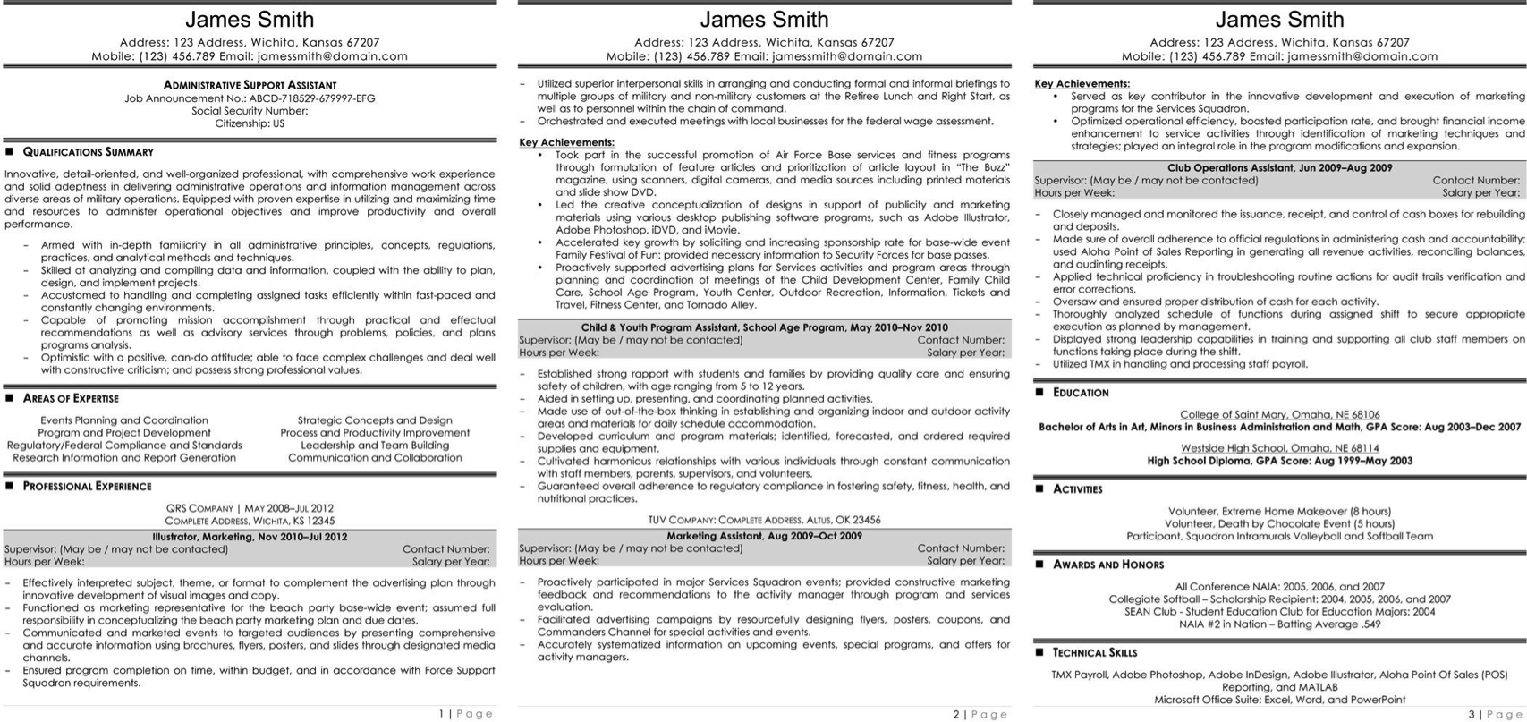 Below is an example of a well-written federal resume. Note, that the announcement/job posting for which the applicant is applying has been listed on the resume. The length of the resume is 3 pages for an entry-mid level position, which can seem lengthy when compared to a ‘regular resume’. This can depend on what you want to include in your resume and how briefly you can write it. Even with federal resumes, which require more information than a private sector resume, it is best to be concise and have a resume that is visually pleasing, yet have the most amount of information on it.
