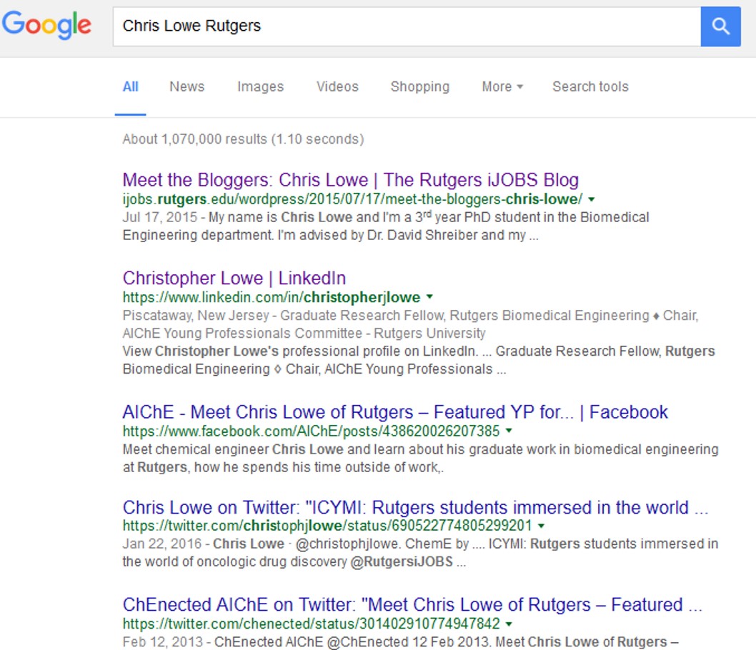 In today’s world, it is inevitable that you’ll be searched for online as you progress through a hiring process. Many of us have probably googled ourselves already. Were you happy with the results?  Were you able to find yourself? Since we know there’s a good chance we’ll be searched for, we can take control of what will appear when that happens. Instead of simply removing or obscuring negative content, fill the web with content you do want potential employers to see about you. Google YourselfThis isn’t new advice, but writing for a blog, or creating your own content from scratch for the web to populate a google search, can seem a daunting task. Worse, it could involve a significant investment of time that we don’t have as graduate students and post-docs under pressure. While these are great options to build a personal brand online, they’re not the only way. Taking some first steps and a few minutes each week can help to set you apart with a professional online presence on social media. LinkedIn One place you know employers will be looking for you is LinkedIn. LinkedIn is pretty quick and easy to set up, especially with the resume import feature and the ability to invite your email contacts. If this is all the time you take to set up your account, it’s a good start, but plan to set aside a little time here and there to improve and expand your profile. While industry resumes need to be trimmed to squeeze everything onto one page, your LinkedIn profile can be a detailed repository of all your past experience. This can include a wealth of information including your publications, projects, awards, coursework as well as examples of your work. This is a great chance to have an expanded resume available to the professional community. LinkedInBeyond your own profile, there is a wealth of other ways to create a presence for yourself on LinkedIn. Follow companies that you’re interested in to stay abreast of news related to the company that could be useful in an interview. There are groups for all sorts of alumni or special interest groups that often host discussions. By taking part in these discussions with thoughtful responses, you can help to build a reputation for yourself. Additionally, when it does come time to look for jobs, taking a few minutes to set up your search filters can help you zero in on a great job for you. LinkedIn uses your profile content to help identify these job suggestions, so having a clearly detailed profile targeted to jobs you are interested in will help to make these suggestions highly relevant to your future career and may even catch the eye of a hiring manager. Twitter A little over a year ago I created my Twitter handle and I didn’t quite know what to expect. What I found was that Twitter can be a powerful tool to stay current in my field, engage with professional and scientific communities, and it can actually be quite a bit of fun. TwitterWith a Twitter account, you can follow companies you’re interested in (@JNJNews, @Merck), major government agencies in your field (@NIH, @NSF), and stay up to date with the latest news (@statnews). Retweet and share stories you find from other accounts to help paint a picture of your interests and what’s important to you. You can also craft your own tweets to share your opinions, contribute to a conversation, or present interesting articles or information you’ve come across. There’s no reason you can’t share your accomplishments either! Many journals have a Twitter presence and frequently retweet authors whom they have recently published (@PLOS, @ACSPublications). This can allow you to get your new paper out there and noticed by an even broader audience. Not only can it be a useful tool, but engaging on Twitter can actually be quite a bit of fun. It’s cool to see things you’ve tweeted get retweeted or favorited by other people all across the globe. These are just a few quick, beginner tips to help build professional content for yourself on the internet. This will make it easier for future employers to find you and for you to control what it is they are seeing about you. In the past we’ve had a couple of other posts on the iJOBS blog which discuss how you can use social media to your advantage in professional realms and those can be found here: Using Social Media to Your Advantage During the Job Hunt – By: Ina Nikolaeva Professional Networking: How to Advance Your Career Using Social Media – By: Itzamarie Chevere-Torres