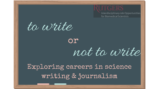 As part of the iJOBS Career Panel Series, on April 14th 2015, Otsuka Pharmaceutical, Biogen and NPR sponsored the Scientific Writing and Journalism career panel held at Rutgers University, Newark campus. I was excited from the moment I found out about this event. Science communication is something that has always been in the back of my mind, but I didn’t quite know how to pursue it. Writing about science for the general public is something that you are not trained for during graduate school, not even while you are a postdoc, unless you learn it on your own. to write or not to write #RutgersiJOBS Participating in this event motivated me to work on my writing skills and gave me some ideas on how to make my science writing reach other people. Thanks to the panelists, Dr. Dylan Harris, Associate Director of Medical Writing at Biogen, and Dr. Jessica McDonnald, health reporter for WHYY-FM, public radio station, for sharing their story on how they were brave enough to move from a career in research academia to science writing careers. I learned that becoming a science writer requires discipline. You have to create a habit of reading lay science magazines, and to participate in social media if you want to find your own voice and style. It could be as demanding and stressful as working in research academia, due to constant deadlines. A great word of advice from the panelists was to target small companies as starting points for your writing career. Small companies are less likely to ask for previous writing experience, and might be willing to train you in the science writing craft. Once you gain the necessary experience you can move on to bigger companies for science writing jobs. In the end, sometimes you may have to create your own opportunities, such as writing your own science blog. Think of the last time you tried to explain your research work to someone outside your science field (i.e. family, friends, etc.). Was it an easy task? Or did you struggle? Science writing and communication are important aspects of what it means to be a scientist. Learning how to communicate our science to others should be part of our education and training. Unfortunately, this is not the case. When you look at curriculum from different science departments, courses on how to improve your science communication and writing skills are lacking.  Do you think it is time for a change in our science education and training system? What do you think will happen to science industry in general if we fail to communicate our findings beyond our benches?